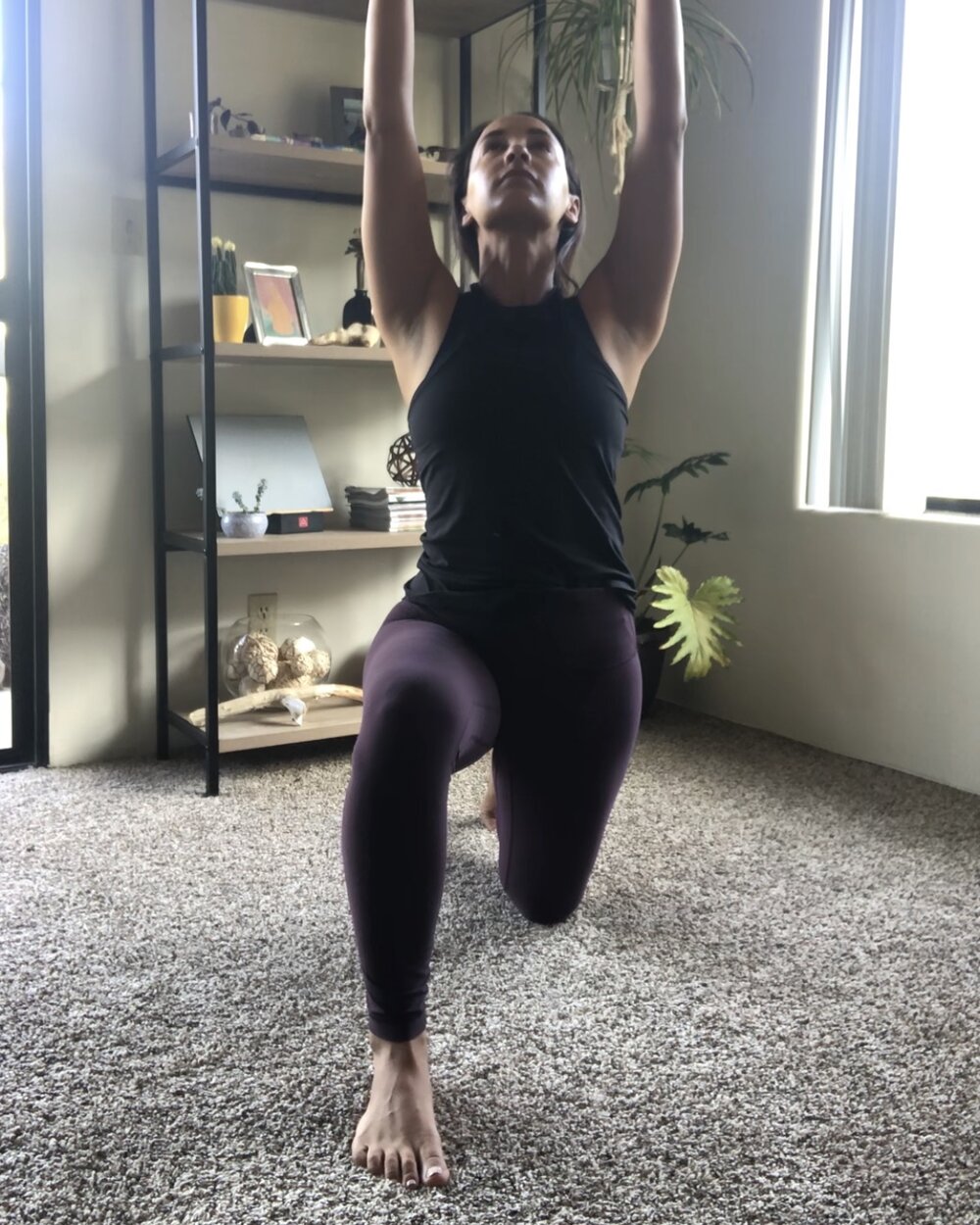 Deceivingly difficult, this is a great progression towards the single leg strengthening needed to get back to more dynamic exercise such as running. Keep your front knee stacked over your ankle and keep your back knee down underneath your hip. Position your pelvis until you feel a stretch along your back leg thigh in the front (hip flexors). Keep your shoulders over your pelvis with your core engaged. Keep your hands at your hips for balance or add your arms overhead. You can challenge your balance by lifting up your chin, gaze upward in between your thumbs. Breathe and hold for 10 seconds and switch sides.