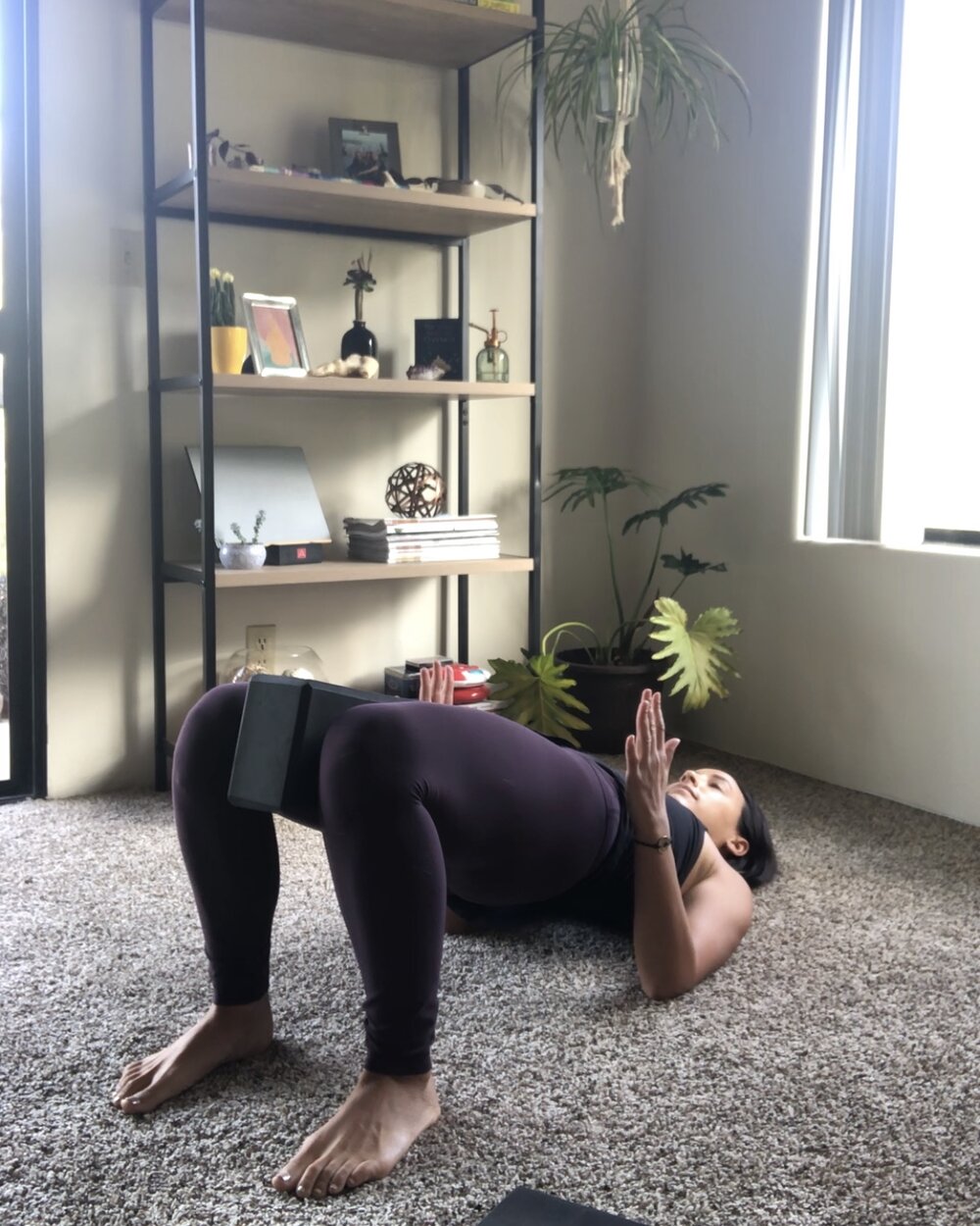 You can begin on your back with your block in between your thighs, feet directly in line with your ischial tuberosities (by your glutes). Press firmly into your feet, backs of your arms and head with your chin off your chest. Engage your pelvic floor, transverse abdominals, and glutes to lift up your pelvis and spine. Squeeze your block gently and hold for 10 seconds or 3 breaths. Lower yourself down and repeat up to 10 times staying aware of your back body and inner thighs, which need strengthening after birth (vaginal or cesarean).