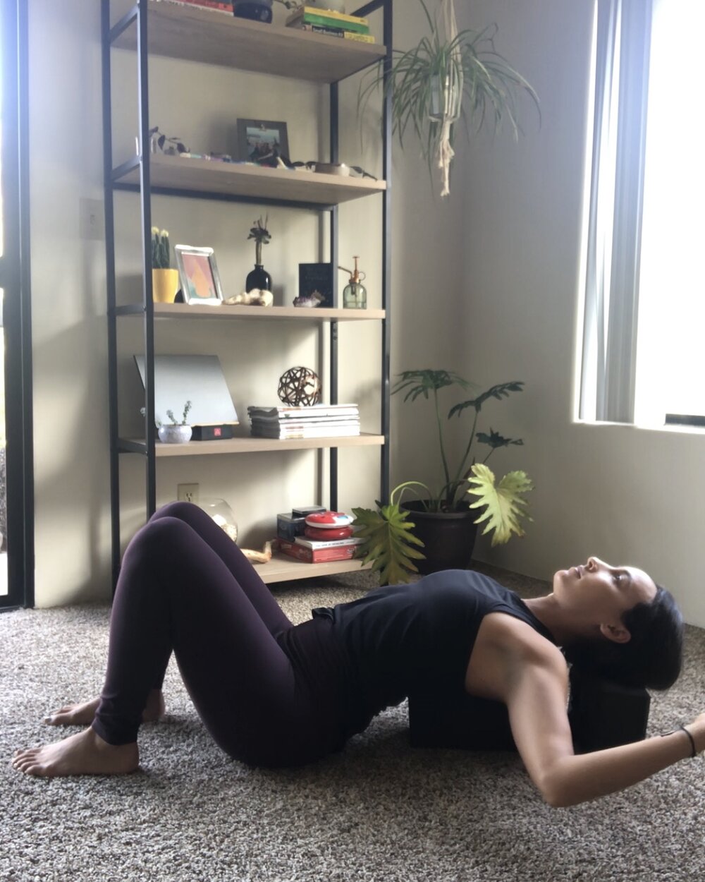 Place one block length wise underneath your upper back along your thoracic spine and place the second one behind your head. Play with the heights, you may want more or less sensation for your back and chest depending on your healing process and how much your baby feeds. This posture is meant to reverse your posture from the feeding and carrying position that rounds in your chest. Take your arms out by your side with your hips grounded and feet firm into the floor. Open up through your pectoralis muscles across your upper chest and let the weight of your arms give you more sensation. Hold for 30-60 seconds. Roll over to the side to get out of this position, especially if you have diastasis rectus (spread or separation of the abdominal muscle).