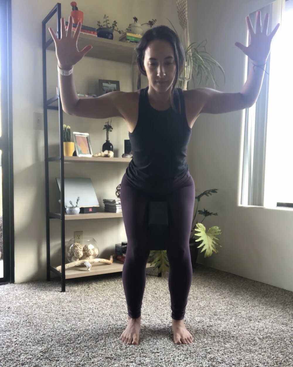 As a functional and foundational pose that follows mountain pose (tadasana), chair pose should be felt in your glutes, core and upper back. With the weight mostly in your heels, sit your hips back until you feel these muscle groups turn on. Keep your spine long without overtucking or over-tilting your pelvis one way. You have many options with your arms, such as the cactus arm position I demonstrate that follows the supported fish pose for strengthening the upper back body and shoulder girdles. Hold for 5 seconds and return to standing. Repeat up to 10 times. Add the block between your thighs to keep your knees in line with your ankles at hip-width distance apart to start. Once you feel ready in your pelvic floor, try holding your baby as a weight.